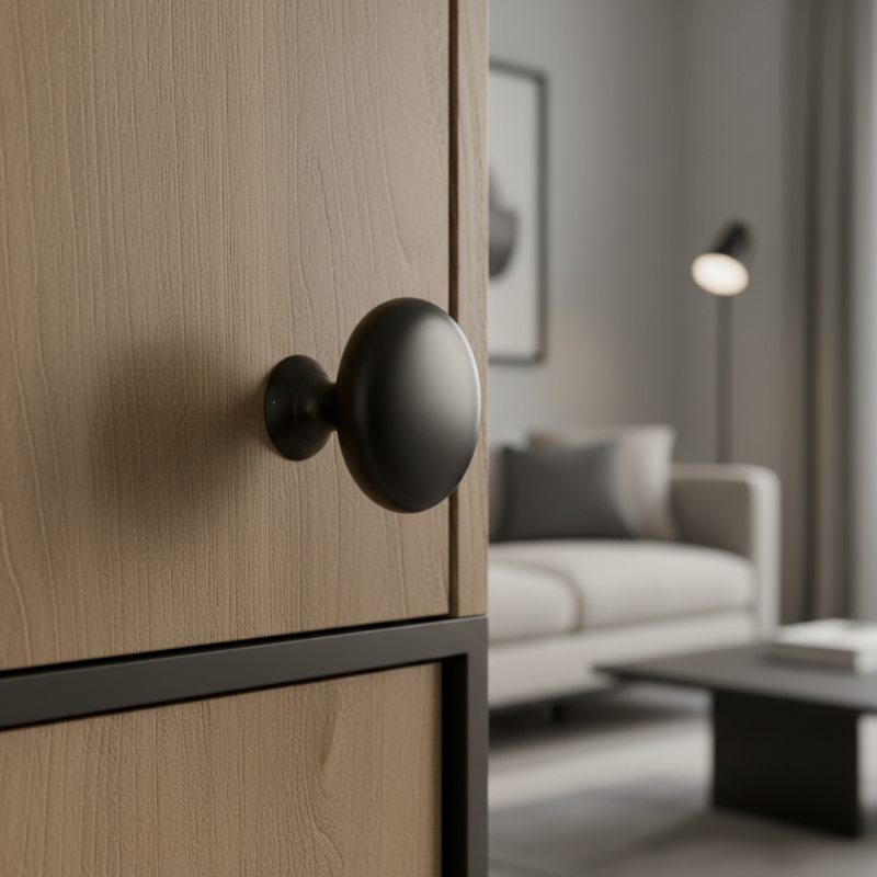 Moderner Knopf BEA in matter schwarzer Ausführung ist ein zeitloses Accessoire, das Ihren Möbeln einen stilvollen und markanten Look verleiht. Seine klare, abgerundete Form und die elegante Oberfläche passen perfekt zu modernen, industriellen sowie minimalistischen Interieurs.