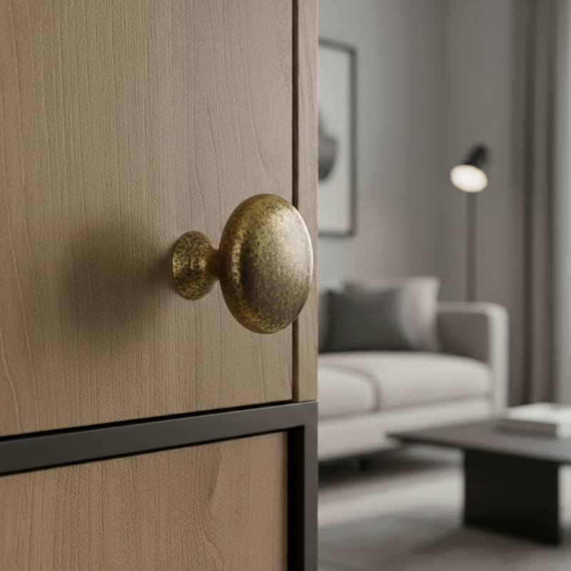 Der Knopf BEA in der Ausführung Altmessing bringt eine warme, elegante und leicht Vintage-Note ins Interieur. Er ist das ideale Accessoire für Möbel im klassischen, ländlichen oder industriellen Stil, wo sein erdiger Metallton den natürlichen und zeitlosen Charakter des Interieurs unterstreicht.