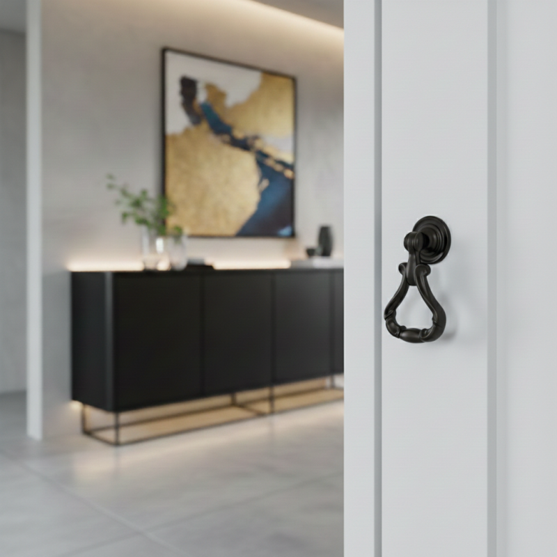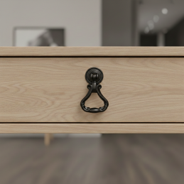 Eleganter rustikaler Möbelknopf CORTINA in mattem Schwarz ist die ideale Ergänzung für Möbel im rustikalen, industriellen und Vintage-Stil. Das reich verzierte Design mit beweglichem unteren Griff verleiht den Möbeln Charakter und sorgt gleichzeitig für eine komfortable Handhabung.