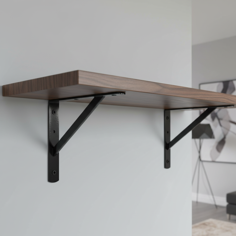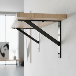 Metallregalhalter im modernen Industriedesign. Zur Wandmontage geeignet, passend für Holz- und Laminatregale. Robuste Konstruktion mit schräger Verstrebung sorgt für hohe Festigkeit und Stabilität.