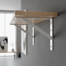 Metallregalhalter im modernen Industriedesign. Zur Wandmontage geeignet, passend für Holz- und Laminatregale. Robuste Konstruktion mit schräger Verstrebung sorgt für hohe Festigkeit und Stabilität.