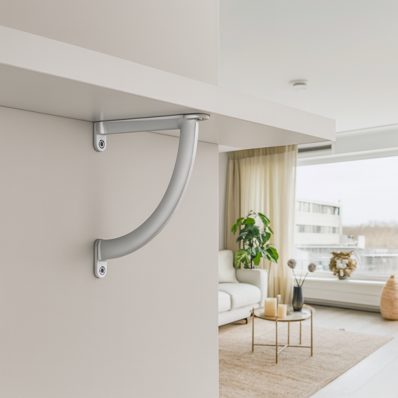 Eleganter und designorientierter Regalhalter mit empfohlener Regalgröße von 200 - 400 mm. Maximale Fachlast ist 100 kg. Die Abmessungen des Halters sind auf den Bildern zu sehen.