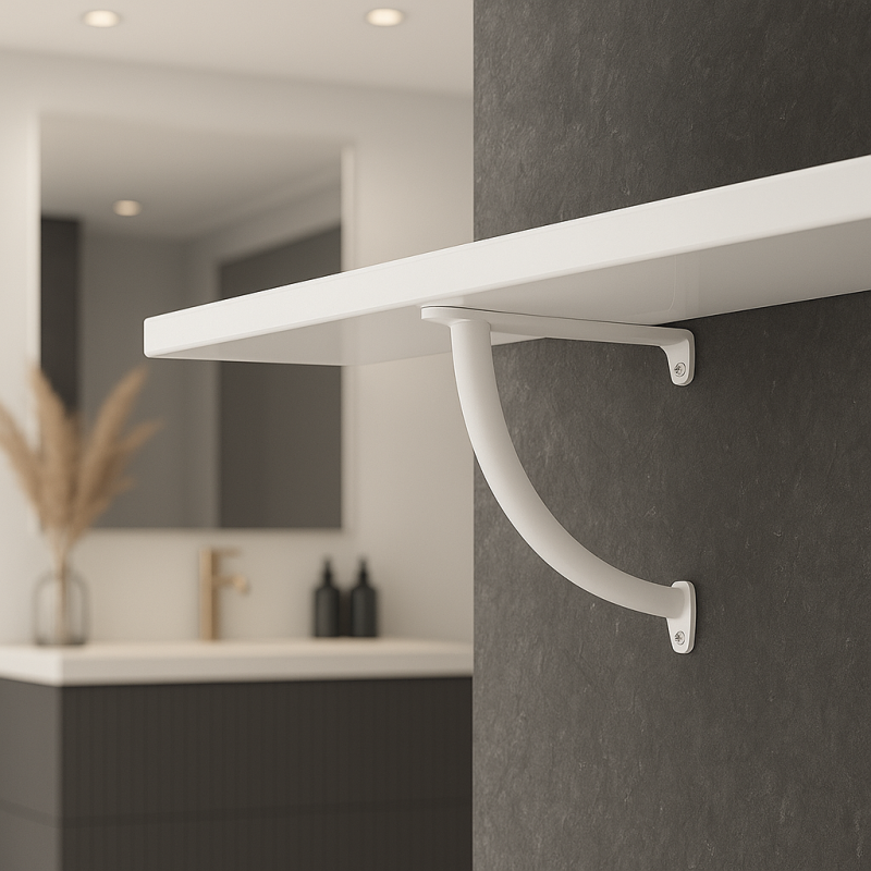 Eleganter und designorientierter Regalhalter mit empfohlener Regalgröße von 200 - 600 mm. Maximale Fachlast ist 150 kg. Die Abmessungen des Halters sind auf den Bildern dargestellt.