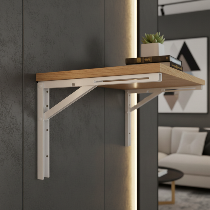 Praktische klappbare Konsole, ideal für die Herstellung von Regalen, Klapptischen, Arbeitstischen oder Bartheken. Dank der robusten Metallausführung und des einfachen Mechanismus ist sie äußerst vielseitig und zuverlässig. Nach dem Einklappen nimmt sie nur minimalen Platz ein, was sie zur perfekten Wahl für kleine Räume macht.