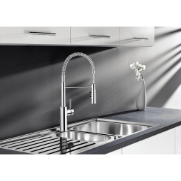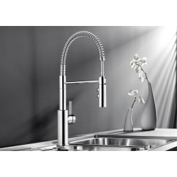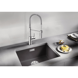 Diese professionelle Küchenarmatur BLANCO vereint modernes Design, hohe Funktionalität und präzise Verarbeitung. Die Edelstahlfeder ermöglicht eine freie Bewegung des Brausekopfes im gesamten Spülbereich, wobei sie einfach im Armaturenkörper arretiert werden kann. Dank der praktischen Lösung bietet sie maximale Freiheit bei der Küchenarbeit – ideal für den alltäglichen sowie intensiven Gebrauch.