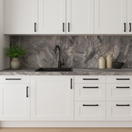 Verleihen Sie Ihrer Küche praktischen Schutz und ein elegantes Aussehen mit unserem Küchenspritzschutz aus hochwertiger Spanplatte, beschichtet mit widerstandsfähigem Laminat. Dieses Material zeichnet sich durch eine hohe Widerstandsfähigkeit gegen Beschädigungen, mechanische Belastung und erhöhte Temperaturen aus, was eine lange Lebensdauer auch bei täglichem Gebrauch garantiert.
