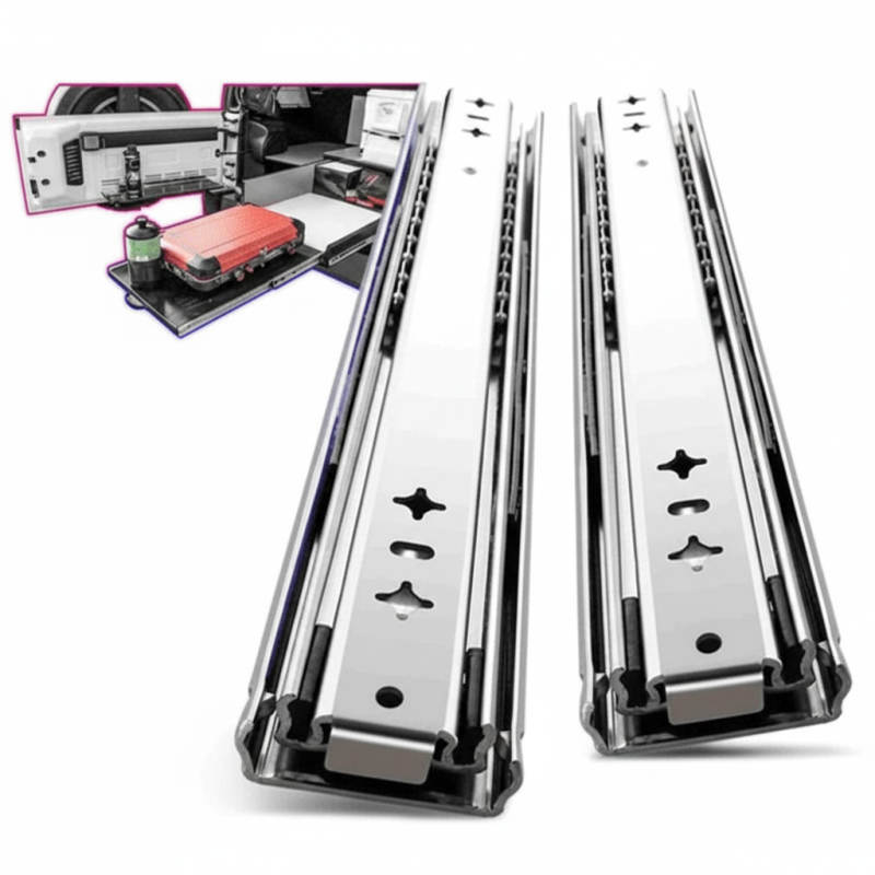 Professioneller Kugelauszug ohne Dämpfung, geeignet für Schubladen mit extremer Belastung oder großer Länge. Ideale Lösung für Werkstätten, Lager, Technikräume, Industrieschränke oder Spezialprojekte, bei denen maximale Festigkeit und Zuverlässigkeit erforderlich sind.