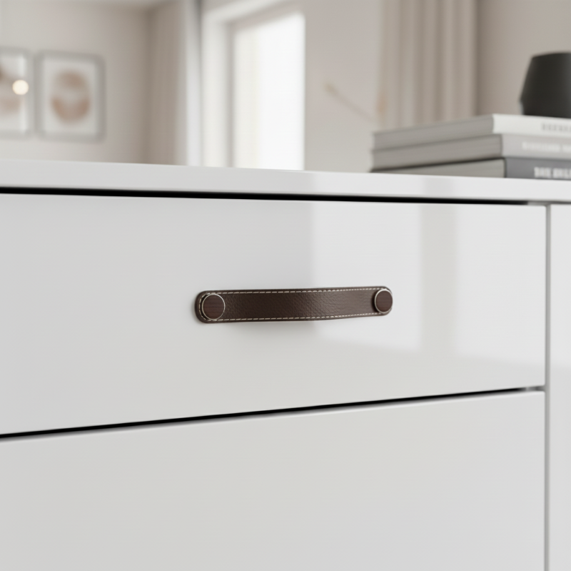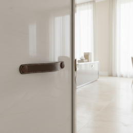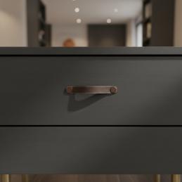 Der elegante Ledergriff CASE in brauner Ausführung ist die ideale Wahl für alle, die eine Kombination aus Naturmaterial, modernem Design und hohem Nutzungskomfort suchen. Echtes Leder mit Kontrastnaht wirkt warm, luxuriös und verleiht den Möbeln einen einzigartigen Charakter. Metallabdeckungen in Bronzeton vervollständigen ihr exklusives Aussehen.