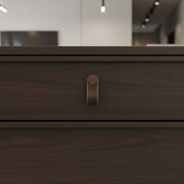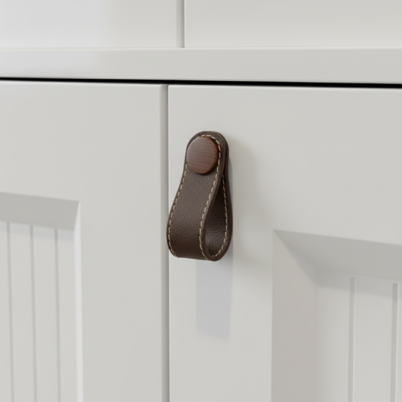 Der elegante Lederknopf CASE in brauner Ausführung ist ein stilvolles Accessoire für jede Art von Möbel. Er kombiniert echtes Leder mit einem hochwertigen Metallelement und einer markanten dekorativen Steppnaht, die seinen handwerklichen Charakter unterstreicht. Dank der weichen Biegung des Leders bietet er einen bequemen Griff und wirkt zugleich ästhetisch und zeitlos.