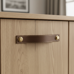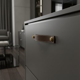 Eleganter und robuster Ledergriff SAMSONITE in brauner Ausführung verleiht Möbeln einen angenehmen natürlichen und zugleich luxuriösen Charakter. Er kombiniert hochwertiges echtes Leder mit massiven Metallschrauben, die ihm einen industriellen Unterton verleihen.
