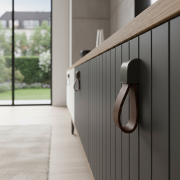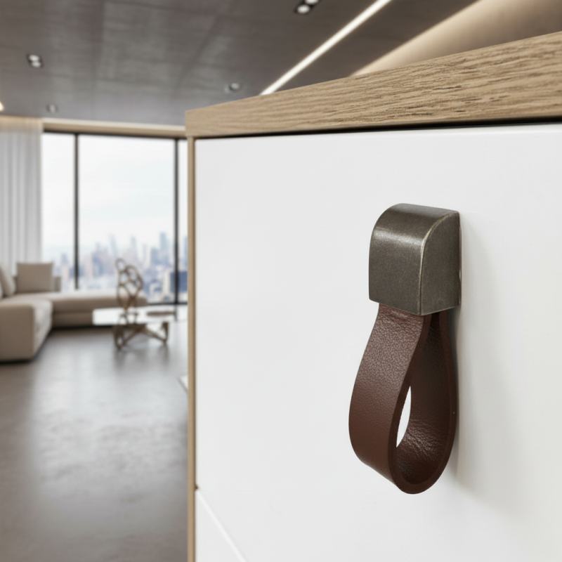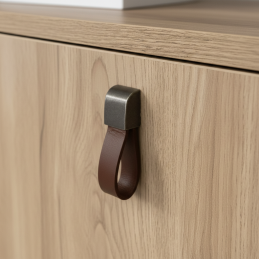 Der Griff ist das ideale Accessoire für moderne, ländliche und industrielle Möbel und dank der natürlichen Flexibilität des Leders bequem und praktisch für den täglichen Gebrauch.