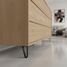 Die matte schwarze Oberfläche ist zeitlos, widerstandsfähig gegen normale Abnutzung und lässt sich einfach mit hellen sowie dunklen Holzdekoren, Laminaten oder lackierten Oberflächen kombinieren. Das SONIA-Bein eignet sich besonders für moderne Kommoden, Schränke, TV-Tische, Couchtische oder Designermöbel im Loft- und Industriestil.