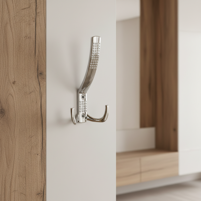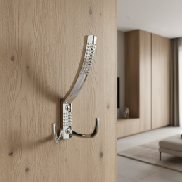 Moderner Möbelhaken in größerer Ausführung mit zwei festen Haken, geeignet für den täglichen Gebrauch. Die glänzende Chromoberfläche verleiht dem Haken ein sauberes, elegantes und zeitloses Aussehen, wodurch er sich hervorragend für moderne Innenräume sowie repräsentative Bereiche eignet.