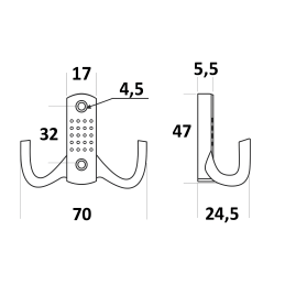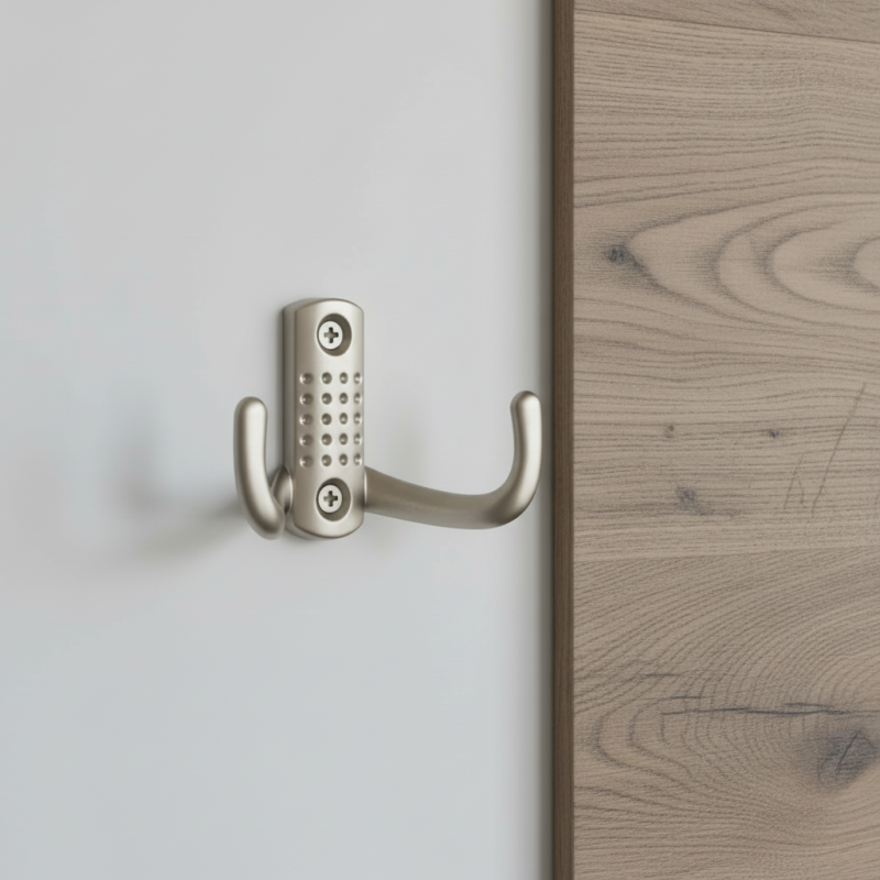 Moderner Möbelhaken mit zwei praktischen Haken, ideal zum täglichen Aufhängen von Kleidung oder Accessoires. Die satinierte Nickeloberfläche verleiht ein dezentes, elegantes Aussehen und passt hervorragend zu modernen sowie klassischen Möbeln.