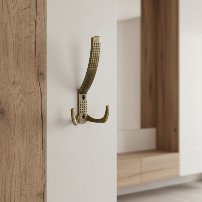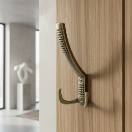Klassischer und markanter Möbelhaken in größerer Ausführung mit zwei robusten Haken, der dank der Oberflächenbehandlung Messing Patina einen eleganten Retro-Touch verleiht. Ergänzt perfekt traditionelle sowie rustikale Interieurs und verleiht den Möbeln einen einzigartigen Charakter.