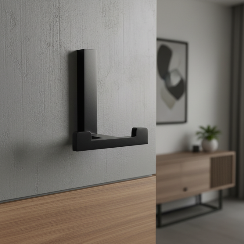 Eleganter NEXT DUO Kleiderhaken im modernen Farbton Schwarz matt ist Teil der Designkollektion NEXT, die verschiedene Arten von Haken im gleichen minimalistischen Stil anbietet.