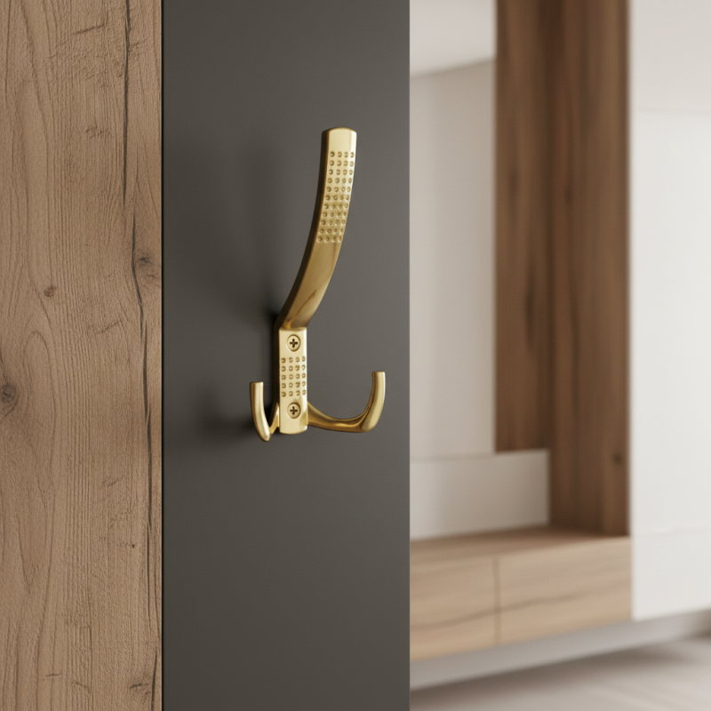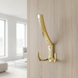 Luxuriöser Möbelhaken in größerer Ausführung mit zwei robusten Haken, der dank der glänzenden goldenen Oberflächenbehandlung außergewöhnlich wirkt und dem Interieur einen Premium-Charakter verleiht. Ideal für elegante Räume, Garderoben, Hoteleinrichtungen oder repräsentative Zimmer.