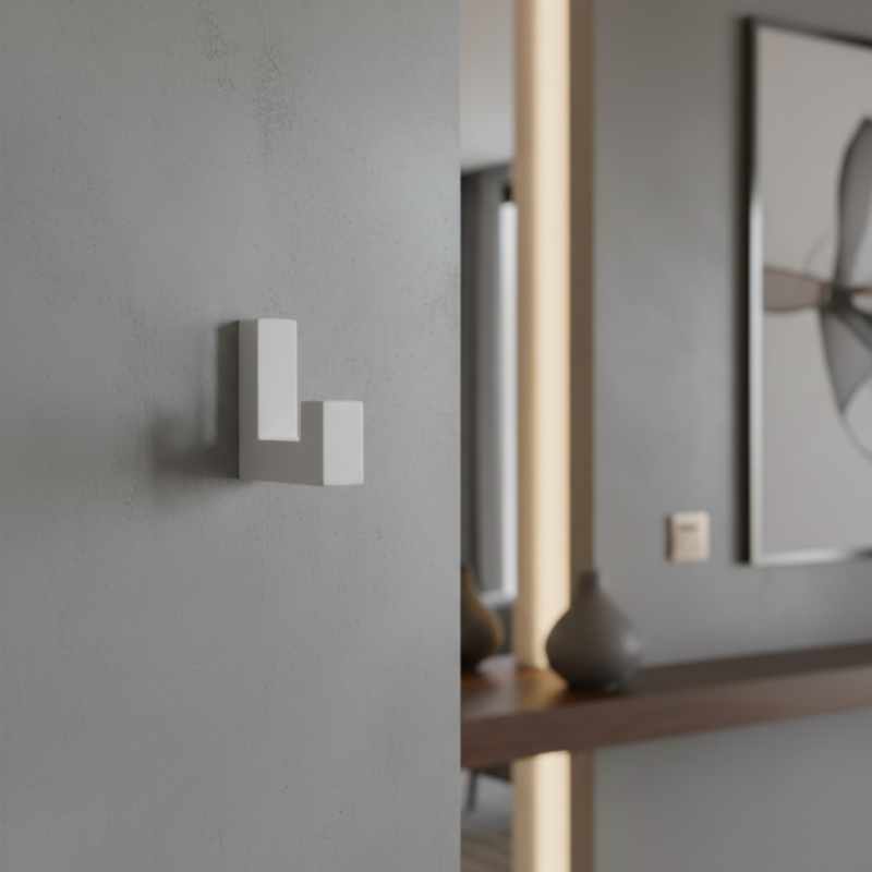 Eleganter und praktischer Kleiderbügel in modernem Design mit Frontmontage auf einer Unterlage. Die Montage ist einfach - die Unterlegscheibe wird mit Dübeln und Schrauben (im Lieferumfang enthalten) an der Wand befestigt, dann wird der Aufhänger darauf montiert und mit einer Schraube von unten fixiert.