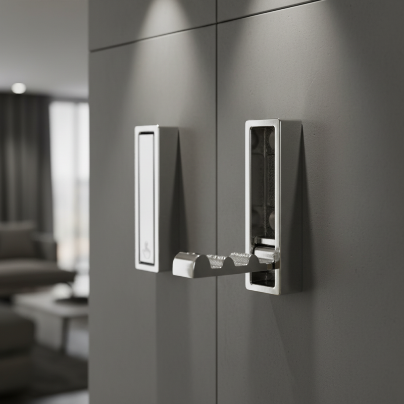 Einfacher, frontal montierter Aufhänger mit einer Höhe von 70 mm und einer Breite von 20 mm. Die Schrauben zur Befestigung sind im Bügel enthalten. Der Aufhänger schwenkt einfach durch Drücken aus. Die Aufhängung ist oberflächenmontiert und muss nicht in Möbel oder Material gefräst werden.
