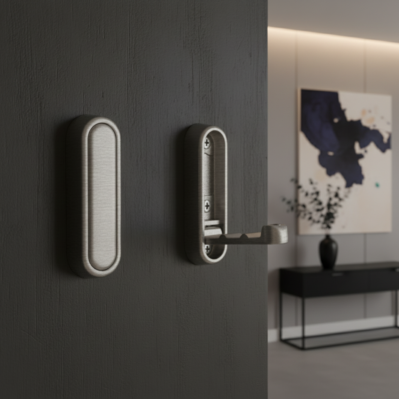 Einfacher, frontmontierter Aufhänger mit einer Höhe von 74 mm und einer Breite von 24 mm. Befestigungsschrauben sind im Lieferumfang enthalten. Der Aufhänger schwenkt einfach durch Drücken aus. Die Aufhängung ist oberflächenmontiert und muss nicht in Möbel oder Material eingefräst werden.
