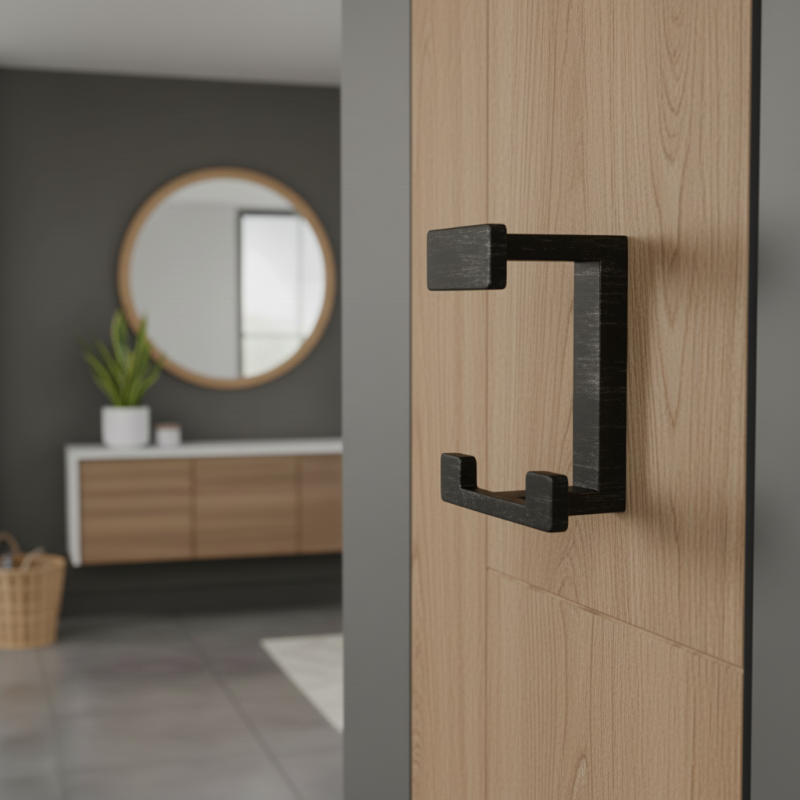 Die gebürstete schwarze Oberfläche verleiht dem Haken einen luxuriösen und zugleich rohen Industriecharakter, der perfekt in Loft- und Designräume passt.