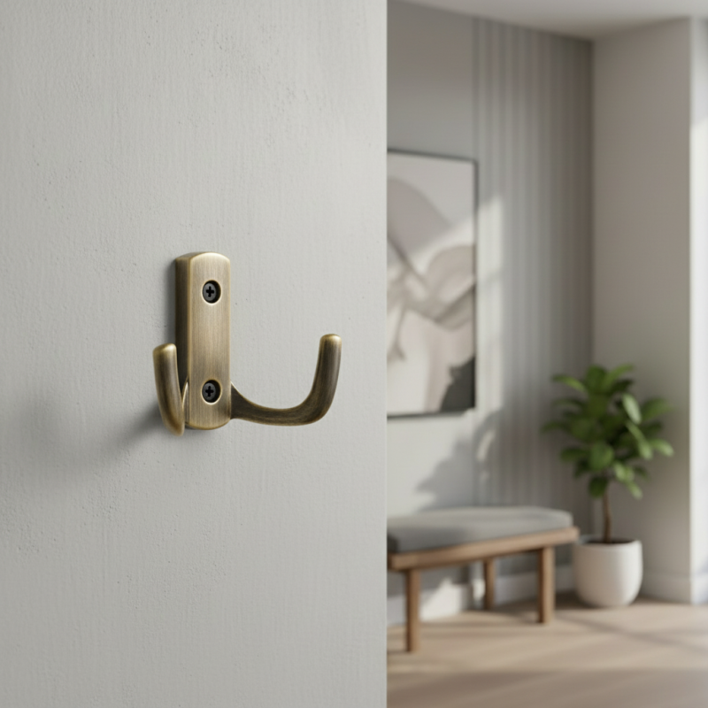 Er kombiniert kompakte Maße mit einem praktischen Doppelhaken, wodurch er ideal zum Aufhängen von Kleidung, Handtüchern, Taschen oder kleineren Accessoires ist.