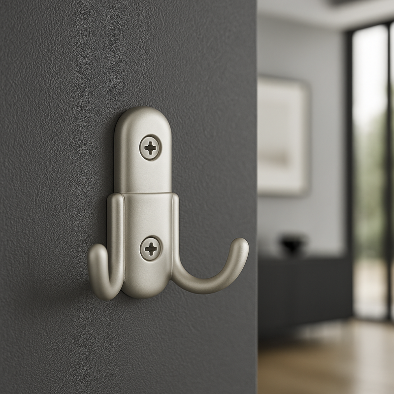 Moderner und kompakter Doppelhaken in eleganter Satin-Ausführung. Dank seiner einfachen Form passt er perfekt in moderne sowie klassische Innenräume – egal ob in den Flur, das Badezimmer, die Küche oder das Schlafzimmer.