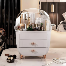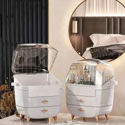 Der Organizer bietet große Aufbewahrungskapazität dank geräumiger Schubladen und großem oberen Stauraum mit transparentem Schutzdeckel, der Kosmetik vor Staub schützt und gleichzeitig einen schnellen und einfachen Überblick über die aufbewahrten Produkte ermöglicht. Parfüms, Cremes, Balsame, Make-up und Hautpflege finden problemlos Platz.