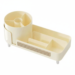 Eleganter und praktischer drehbarer Organizer MAKEUP in zartem cremefarbenem Design ist die ideale Lösung für die übersichtliche Aufbewahrung von Kosmetik, Pinseln und täglichen Beauty-Accessoires. Die helle, neutrale Farbe wirkt sauber und harmonisch, wodurch sich der Organizer leicht jedem Interieur anpasst.