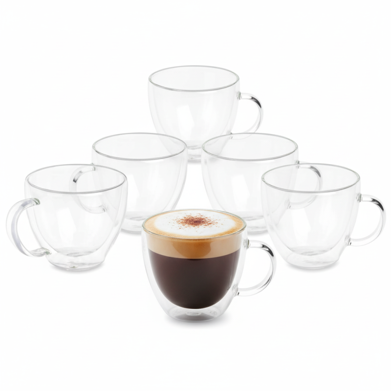Doppelwandiges Glas hält Ihr Getränk länger warm oder kalt, während die Außenseite des Glases angenehm kühl bleibt. Das transparente Design verleiht den Gläsern ein modernes Aussehen und ermöglicht es, den visuellen Effekt von Kaffee, Tee oder anderen Getränken voll zu genießen.