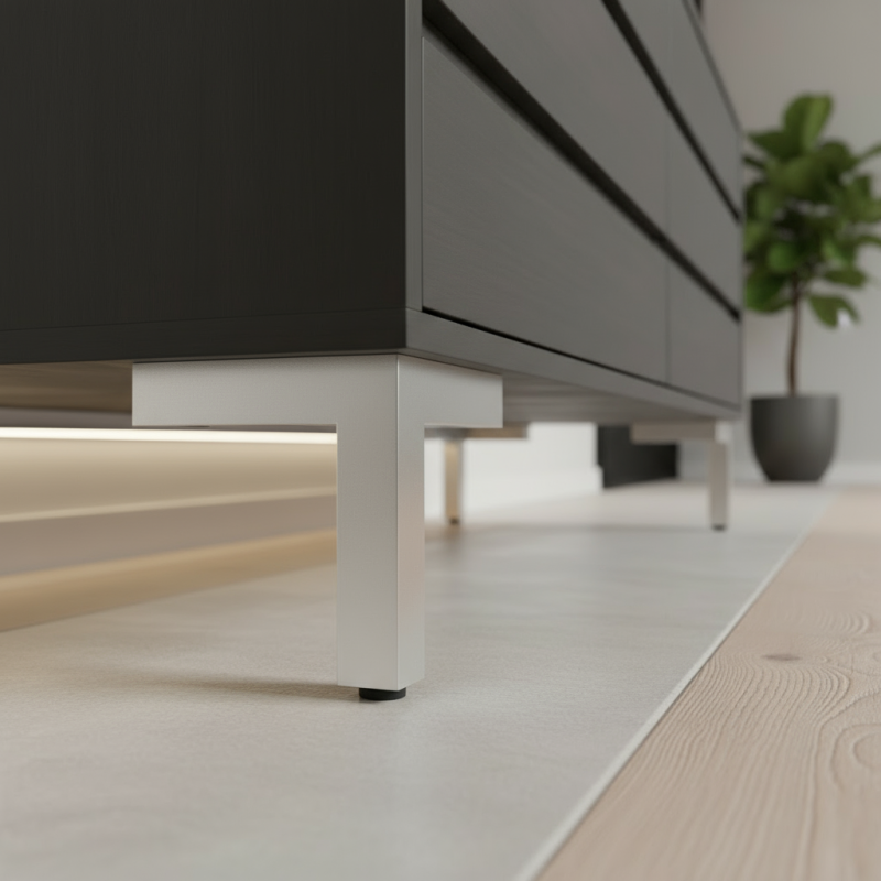 Universeller Möbelfuß ANGEL in der Oberflächenbehandlung silber ist eine moderne und praktische Lösung für Kommoden, Schränkchen, Nachttische, Konferenz- oder TV-Tische und andere Möbeltypen.