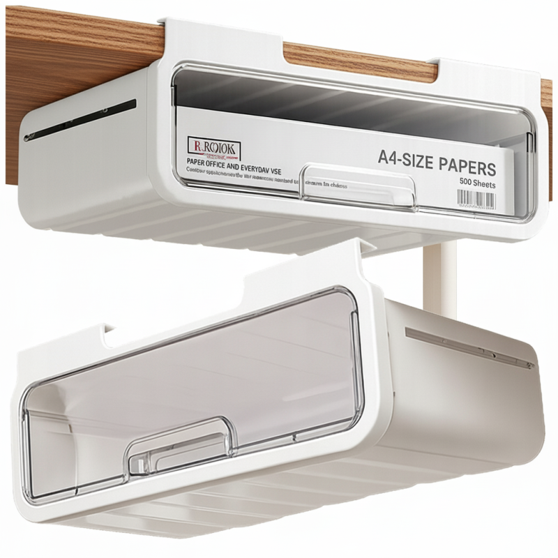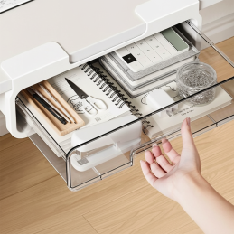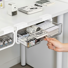 Die Montage ist äußerst einfach und ohne Bohren – die Schublade wird einfach mit dem selbstklebenden Halter befestigt. Sie ist daher auch für Mietwohnungen oder Büros geeignet.