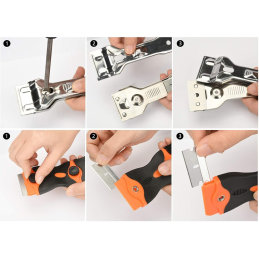 Die Packung enthält 5 scharfe Metallklingen für hartnäckigen Schmutz und 1 Kunststoffklinge für empfindliche Oberflächen. Die Klingen lassen sich einfach und schnell austauschen.