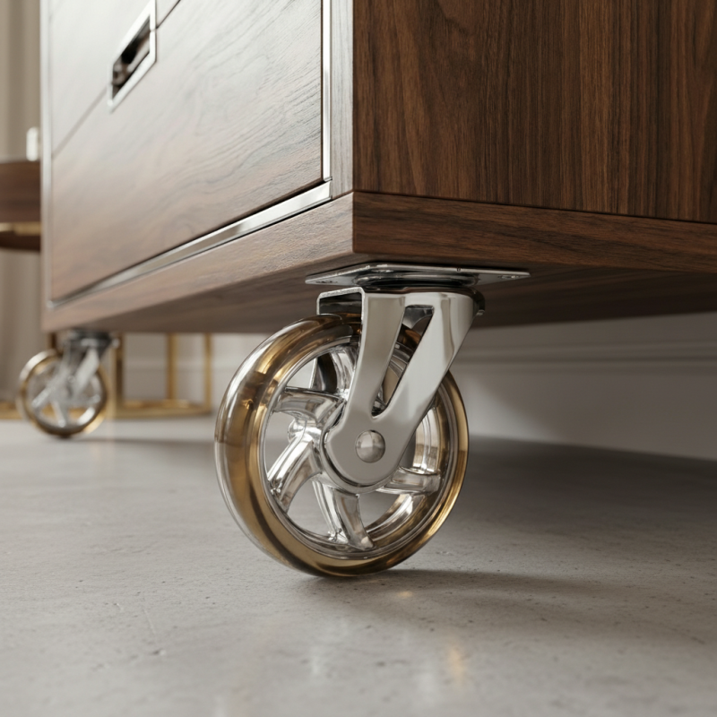 Hochwertiges drehbares Möbelrad in Ausführung transparentes Braun mit verchromter Halterung ist ideal für verschiedene Möbeltypen – Schränke, Tische, Regale oder mobile Container. Das moderne Design mit dem transparenten Rad wirkt elegant und zugleich praktisch.