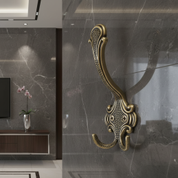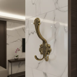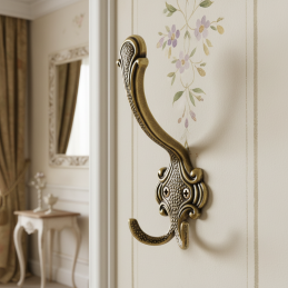 Rustikaler Kleiderhaken VENICE in der Oberflächenbehandlung Alt-Messing stellt ein elegantes und markantes Accessoire für das Interieur dar. Seine reich geformten Linien, das Reliefdekor und das klassische Aussehen schaffen eine authentische Vintage- und Landhausatmosphäre. Dank des verlängerten Arms und des Doppelhakens bietet er praktische Nutzung im Flur, Bad, in der Küche oder im Kleiderschrank.