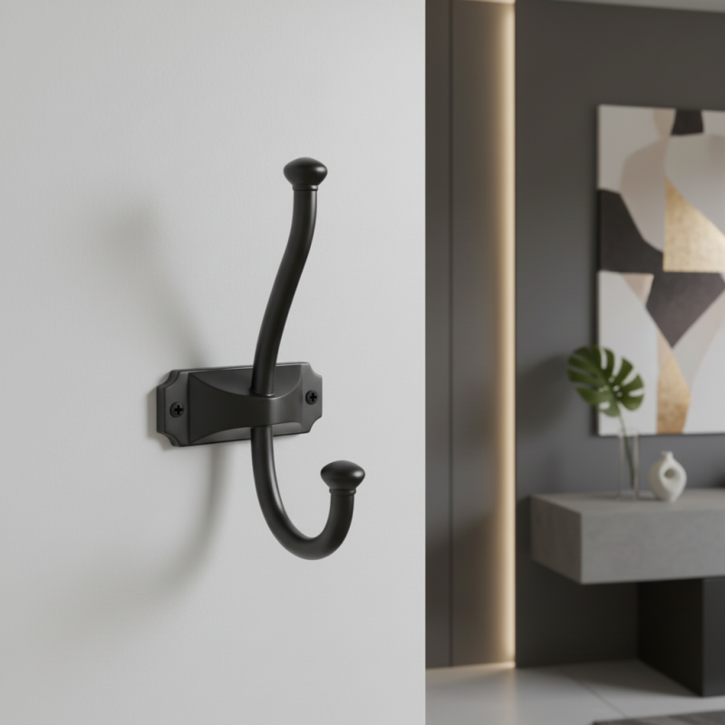 Die Möbelgarderobe PORTO in modernem mattschwarzem Finish ist eine elegante und praktische Lösung für Flure, Ankleidezimmer, Badezimmer oder Schlafzimmer. Ihre klassische Doppelhakenform ermöglicht ein bequemes Aufhängen von Kleidung, Taschen oder Accessoires, wobei sowohl der obere als auch der untere Haken ausreichend Platz und Stabilität bieten.