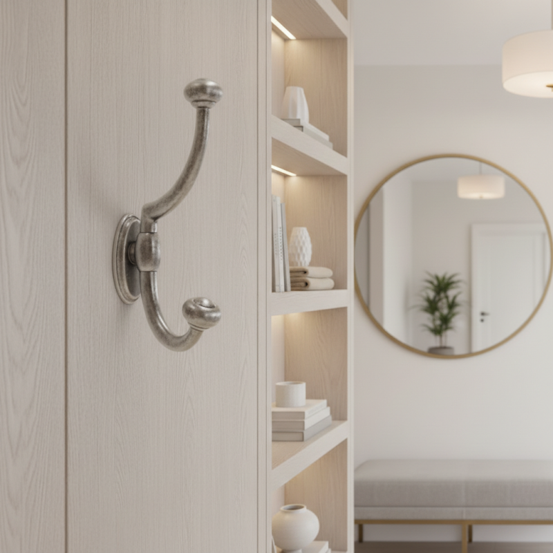 Der Haken ist für die Rückmontage in Möbel oder Möbelwände vorgesehen, wodurch er sauber und ästhetisch ohne sichtbare Befestigungselemente wirkt. Die hochwertige Metallverarbeitung sorgt für hohe Festigkeit, Stabilität und Langlebigkeit auch bei täglichem Gebrauch.