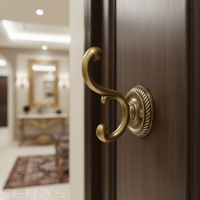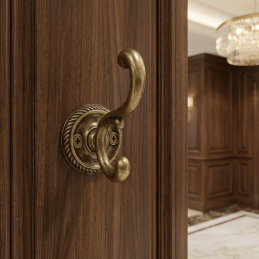 Der rustikale Kleiderhaken GALILEO in der Ausführung altmessing ist ein elegantes und funktionales Accessoire für klassische und rustikale Interieurs. Der reich verzierte doppelte Haken in Kombination mit einer dekorativen runden Rosette verleiht dem Haken einen traditionellen Charakter und einen hohen ästhetischen Wert.