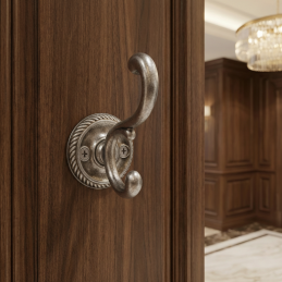 Rustikaler Kleiderhaken GALILEO in eleganter Ausführung Alt-Silber ist ein stilvolles und funktionales Accessoire für klassische sowie rustikal gestaltete Innenräume. Der reich verzierte doppelte Haken in Kombination mit einer dekorativen runden Rosette verleiht dem Haken einen traditionellen Charakter und einen markanten visuellen Effekt.