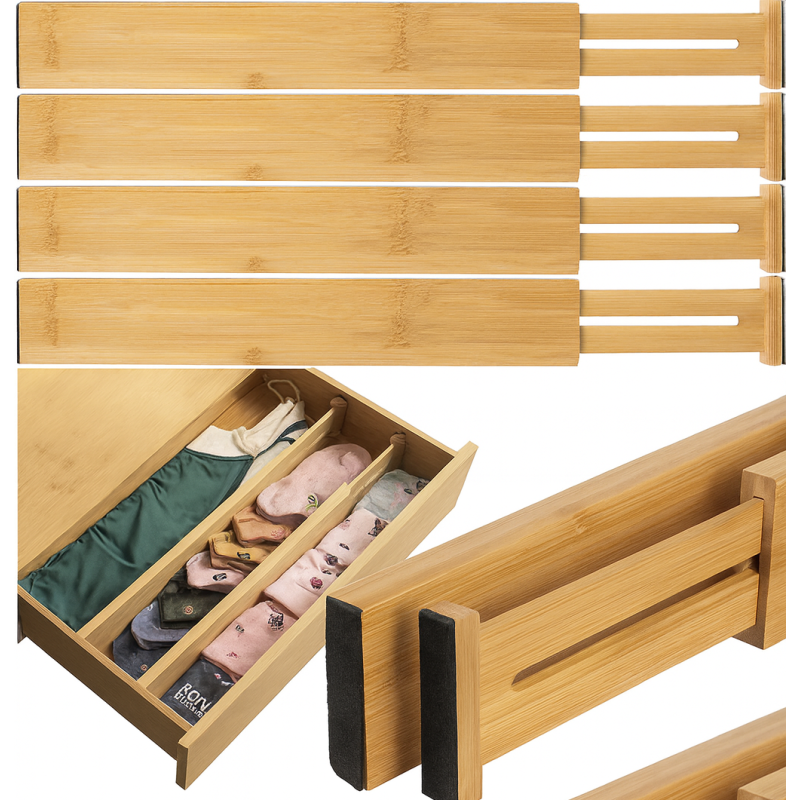 Stellen Sie sich vor, Sie finden alles genau dort, wo es sein soll, wenn Sie eine Schublade öffnen. Kein Suchen, kein Chaos, nur pure Ordnung und Harmonie. Mit unserem Set aus 4 verstellbaren Schubladenorganisatoren ist das nicht nur ein Traum, sondern eine Realität, die Sie jeden Tag genießen können. Dieses elegante und funktionelle Accessoire wurde entwickelt, um Ihren Raum zu verändern und Ihr Leben zu vereinfachen.