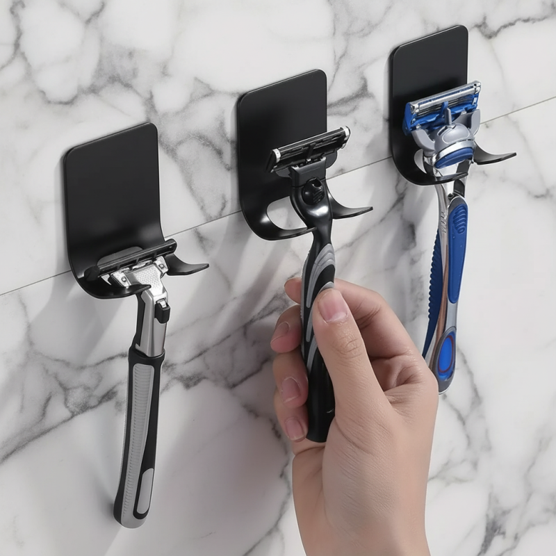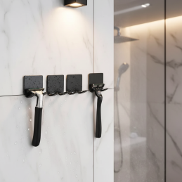 Praktischer selbstklebender Rasierhalter in eleganter schwarzer Farbe ist das ideale Accessoire für jedes Badezimmer. Dank des minimalistischen Designs und der kompakten Abmessungen bietet er einen unauffälligen, hygienischen und sicheren Platz zur Aufbewahrung des Rasierers.