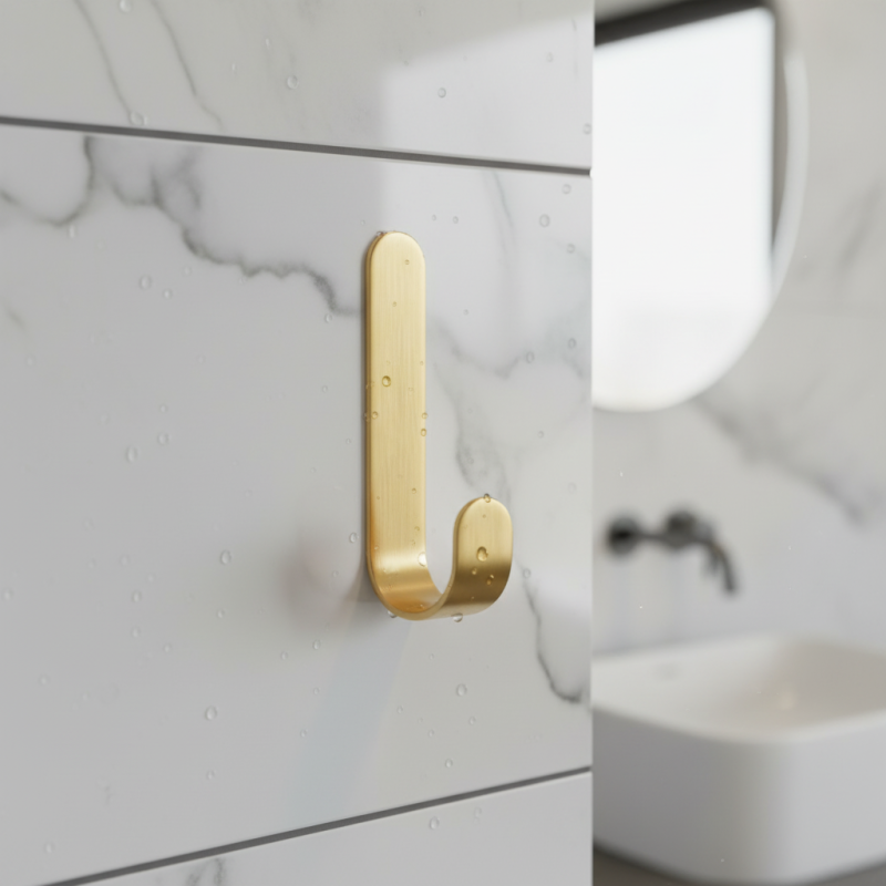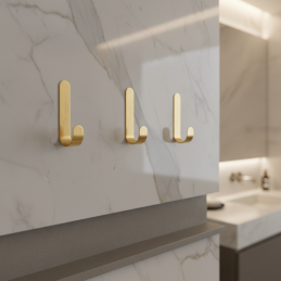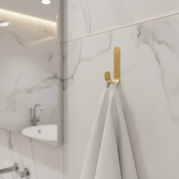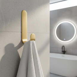 Eleganter selbstklebender Haken LAXO in moderner gebürsteter Gold-Optik ist ein stilvolles und praktisches Accessoire für Bad, Küche oder Flur. Dank der minimalistischen Form passt er in jedes Interieur und bietet einen funktionalen Platz zum Aufhängen von Handtüchern, Bademänteln oder Accessoires.