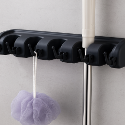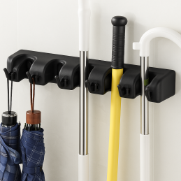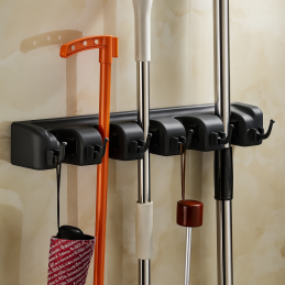 Eine Ablage für Reinigungsutensilien, mit der Sie Ihre Küche oder Speisekammer praktisch und platzsparend organisieren können. Mit 5 Löchern und 6 Haken ist er ideal zum Aufhängen von Besen, Mopps, Kehrschaufeln und Küchenhandtüchern. .