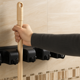 Die Schlitze sind mit Rollkugeln versehen, die sich der Dicke des Besen- oder Moppstiels anpassen und diesen festhalten. Das Lösen der Kugeln ist ganz einfach, indem man den Besenstiel leicht anhebt. Mit den mitgelieferten Schrauben sehr einfach zu montieren.