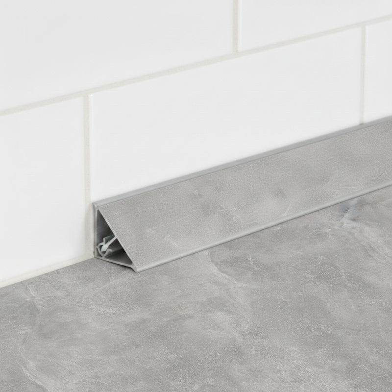 Sie besteht aus zwei Teilen – der untere Teil wird angeschraubt oder aufgeklebt auf die Arbeitsplatte und der obere wird anschließend eingeklickt in den unteren Teil. So entsteht ein fester, präziser und ästhetisch einheitlicher Abschluss im gleichen Dekor wie die Arbeitsplatte.