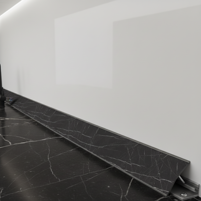 Sie besteht aus zwei Teilen – der untere Teil wird verschraubt oder geklebt auf die Arbeitsplatte und der obere wird anschließend eingeklickt in den unteren Teil, wodurch ein fester, präziser und ästhetischer Abschluss im gleichen Dekor wie die Arbeitsplatte entsteht.