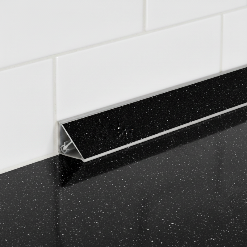 Luxuriöse und auffällige Abschlussleiste KRONOSPAN im Dekor Andromeda Schwarz Hochglanz (K218 GG) ist für den professionellen und präzisen Abschluss von Arbeitsplatten bestimmt. Die Leiste dichtet die Verbindung zwischen Arbeitsplatte und Wand zuverlässig ab und verhindert so wirksam das Eindringen von Wasser und Schmutz. Gleichzeitig verleiht sie der Küche ein exklusives und elegantes Aussehen von schwarzem Marmor mit feinem Glitzereffekt und hohem Glanz.