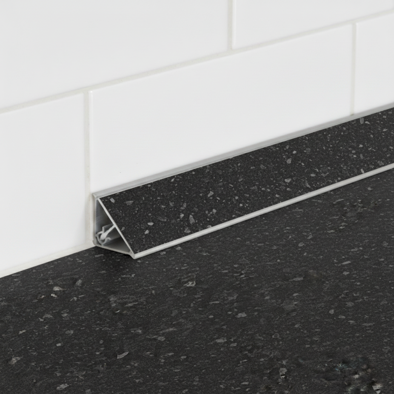 Die elegante und moderne Abschlussleiste KRONOSPAN im Dekor Flint Schwarz matt (K210 PE) ist für den professionellen und präzisen Abschluss von Arbeitsplatten bestimmt. Die Leiste dichtet die Verbindung zwischen Arbeitsplatte und Wand zuverlässig ab und verhindert so wirksam das Eindringen von Wasser und Schmutz. Gleichzeitig verleiht sie der Küche ein luxuriöses, industrielles Aussehen von dunklem Stein oder Metall mit matter Oberfläche.