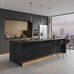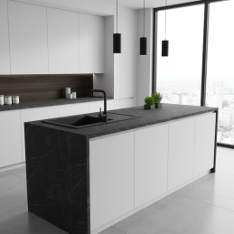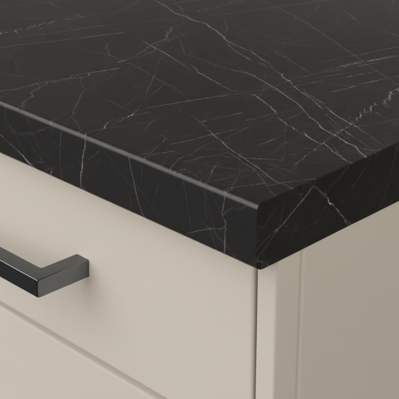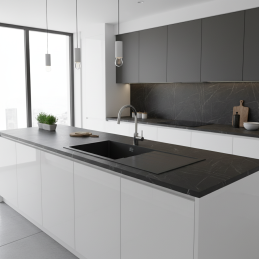Die Arbeitsplatte EGGER Pietra Grigia Schwarz (F206 ST9) bringt die Eleganz von Naturstein in moderner Ausführung in den Innenraum. Die Oberfläche im dunklen Marmor-Dekor mit feiner Textur in der Struktur ST9 Smoothtouch Matt wirkt luxuriös, aber dennoch dezent und lässt sich leicht mit Holz- sowie minimalistischen Dekoren kombinieren.