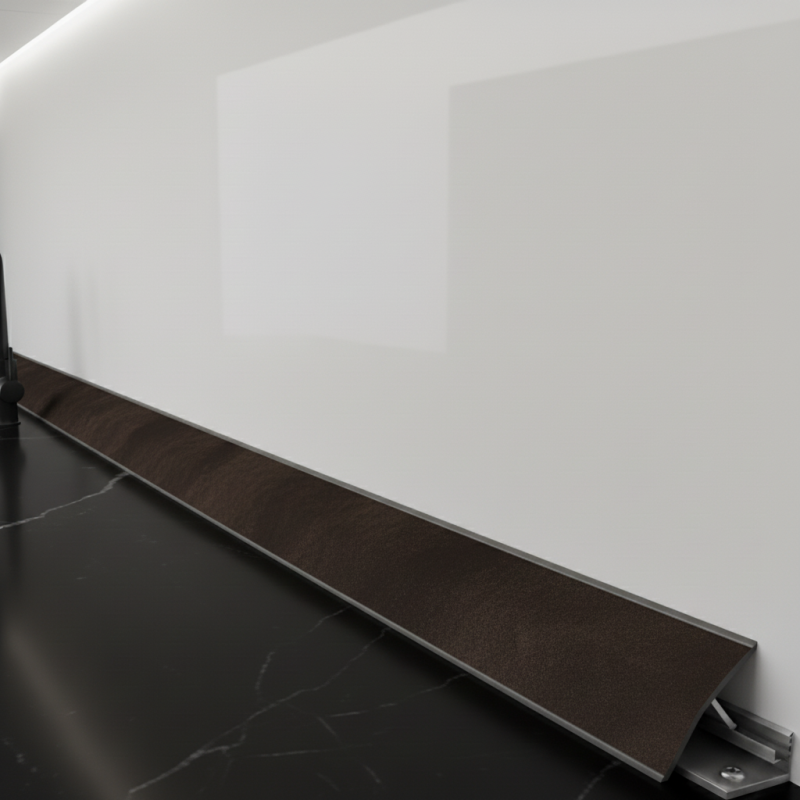 Sie besteht aus zwei Teilen – der untere Teil wird auf die Arbeitsplatte geschraubt oder geklebt und der obere anschließend eingeklickt in den unteren Teil. So entsteht ein fester, präziser und einheitlicher Abschluss im gleichen Dekor wie die Arbeitsplatte.